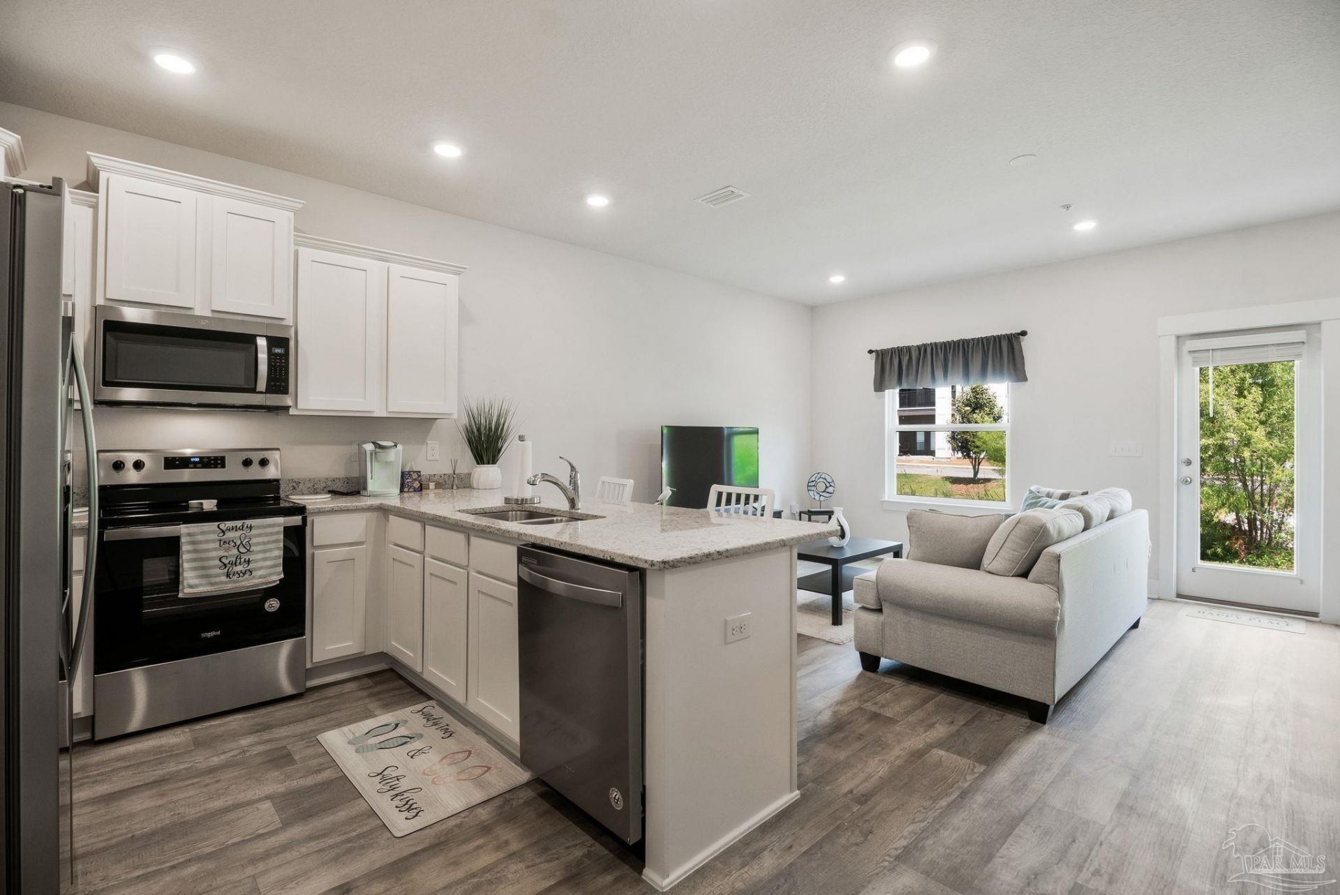 ***OPEN HOUSE 4/25 Saturday 9:30 - 11:30 4/26 Sunday 10:30 - 12:30*** Welcome to Admiral's Quarters in Pensacola, Florida, where comfort, convenience, and low-maintenance living come together in this beautifully appointed 3-bedroom, 2.5-bath townhome. Ideally situated near shopping, dining, medical care, Navy Federal Credit Union, Publix, Neighborhood Walmart, Home Depot, Lowe's, and a variety of restaurants and local conveniences, this home offers an outstanding central location. Inside, the open-concept floor plan creates a spacious and inviting atmosphere that is perfect for entertaining and everyday living. The kitchen is designed with both style and function in mind, featuring stainless steel appliances, granite countertops, a large breakfast bar, undermount sink, pantry, and recessed lighting. The seamless flow between the kitchen, dining, and living areas makes gathering with family and friends easy and enjoyable. The primary suite provides a relaxing retreat with a walk-in closet and adjoining bath complete with a granite double vanity, shower, and linen closet. Two additional bedrooms offer flexibility for guests, family, or a home office. Luxury vinyl plank flooring enhances the main living areas, while carpet in the bedrooms adds warmth and comfort. Additional highlights include a one-car garage, sprinkler system, fabric hurricane window protection, and all furnishings conveying, including the TV. Residents of Admiral's Quarters enjoy access to a large community pool and clubhouse with fenced dog park. The HOA fee of $164 per month covers insurance on the building, roof, structure, wall studs, and windows, along with lawn care, front flower bed maintenance, annual gutter cleaning, and yearly termite inspection. This move-in-ready townhome offers modern finishes, valuable HOA benefits, and an exceptional Pensacola location. Schedule your private showing today.
